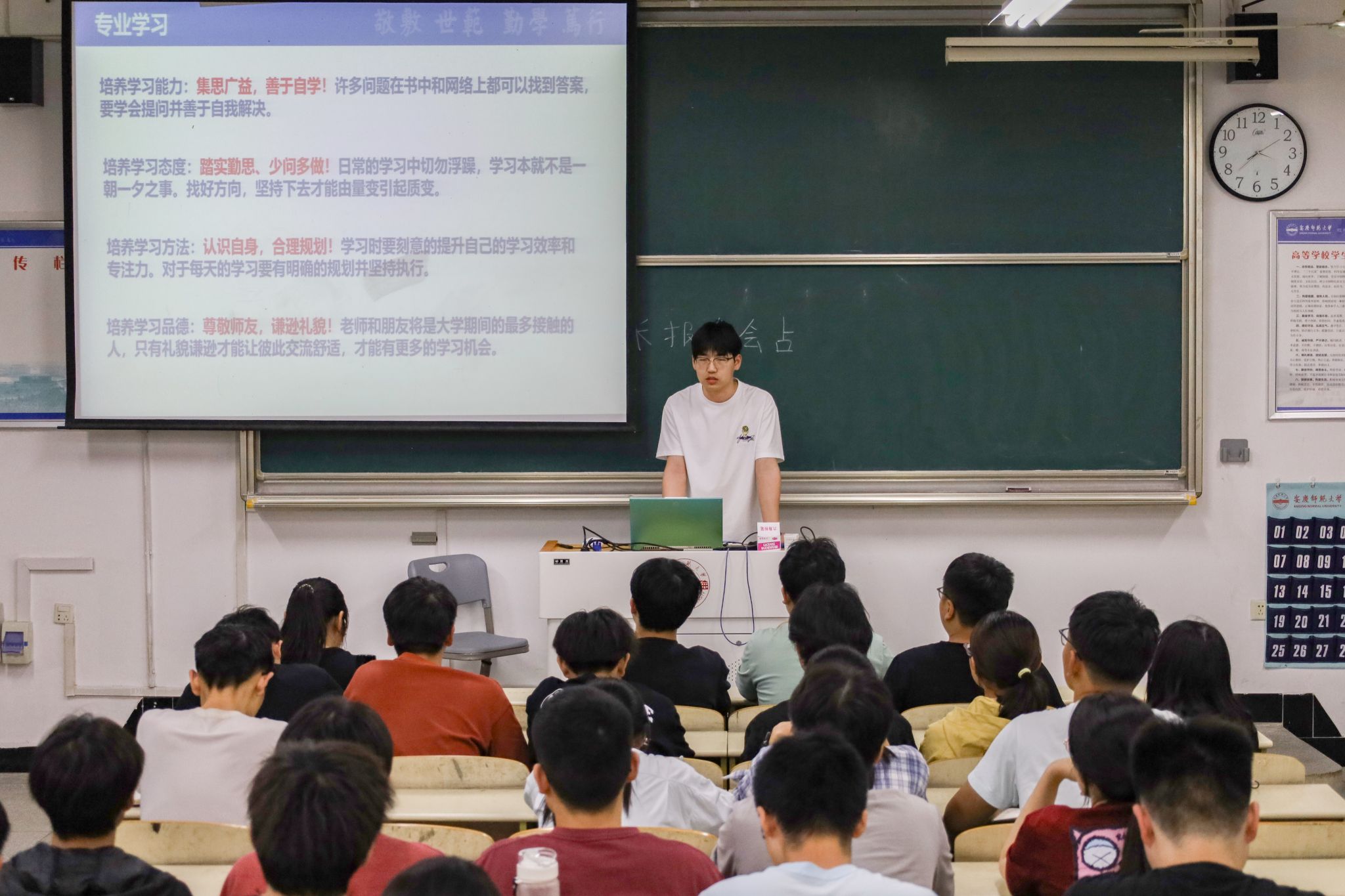 “考研是一个不断试错的过程,不要怕‘踩坑’,我们要探索适合自己的学习方法。”计算机科学与技术专业2020(1)班的丁本馨表示,有考研打算的员工要掌握科学的备考方法,合理运用真题资料,积极做好反思总结。物联网工程专业2020级的周宇手持粉笔,在黑板上为同学们梳理出考研的各个阶段及相应的备考方法,“考研是一场持久战,要静得下心,坐得了冷板凳,正视自身的负面情绪,寻找合理的宣泄方法”他说。
