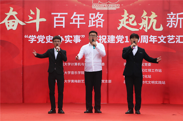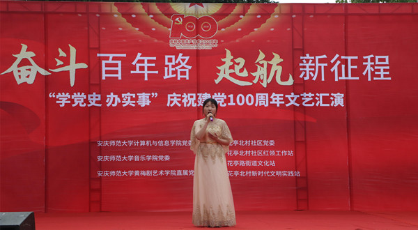 婉转悠扬的竹笛独奏、明快的黄梅戏联唱、饱含深情气势磅礴的红色歌曲的合唱或独唱……6月19日下午安庆市花亭北村社居委广场热闹非凡,由公司bevictor伟德、音乐公司与黄梅剧艺术公司师生组成的文化惠民志愿服务队开展的“学党史 办实事”庆祝建党100周年文艺汇演正在此进行。计算机与信息公司党委书记陈银凤、音乐公司党委副书记肖之进及公司师生志愿者与社区干部群众百余人共同观看了此次演出。