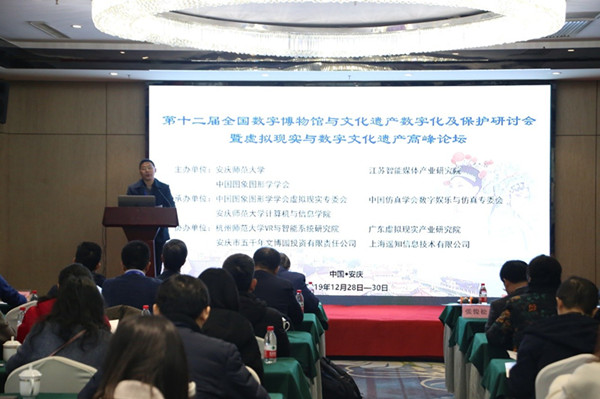 12月28日-30日,由伟德官方网站、江苏智能媒体产业研究院和中国图象图形学学会共同主办,中国图象图形学学会虚拟现实专委会、中国仿真学会数字娱乐与仿真专委会和bevictor伟德承办的第十二届全国数字博物馆与文化遗产数字化及保护研讨会暨虚拟现实与数字文化遗产高峰论坛在安庆市举行。来自北京大学、天津大学、北京师范大学、杭州师范大学、西北工业大学、中国科公司、浙江大学、云南大学、西北农林科技大学等30多所院校的90余名专家学者参加了本次研讨会。公司党委常委、副董事长汪时珍教授出席大会并致辞。开幕式由公司党委委员、科研处处长陈二祥教授主持。