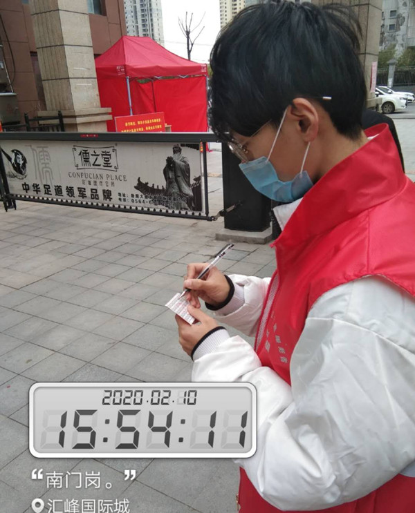 在社区门口,穿上红色的志愿者服装,钱坤不仅协助检查来往人员、车辆情况,耐心地做着登记、测量体温、宣传防疫知识,而且加入社区业主群,每天定时转发官方渠道疫情最新消息,并对所在地六安市的疫情作出详细分析,提醒业主们疫情防范相关注意事项。