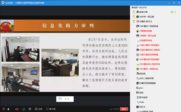 金京围绕“民法典亮点解析”进行宣讲,详细介绍了被誉为“市民生活的百科全书”的民法典中个人信息保护、高空抛物、人格权等内容,结合司法实务案例就当前的高利校园贷、校园欺凌等进行普法;结合同学们线上关于“信息化与审判关系”等提问,金京法官结合自己计算机专业知识、工作经历进行分享解答,并以安庆市中级人民法院“简案快审”网上开庭、网上调解等工作介绍了疫情期间信息化在案件审理中的作用。