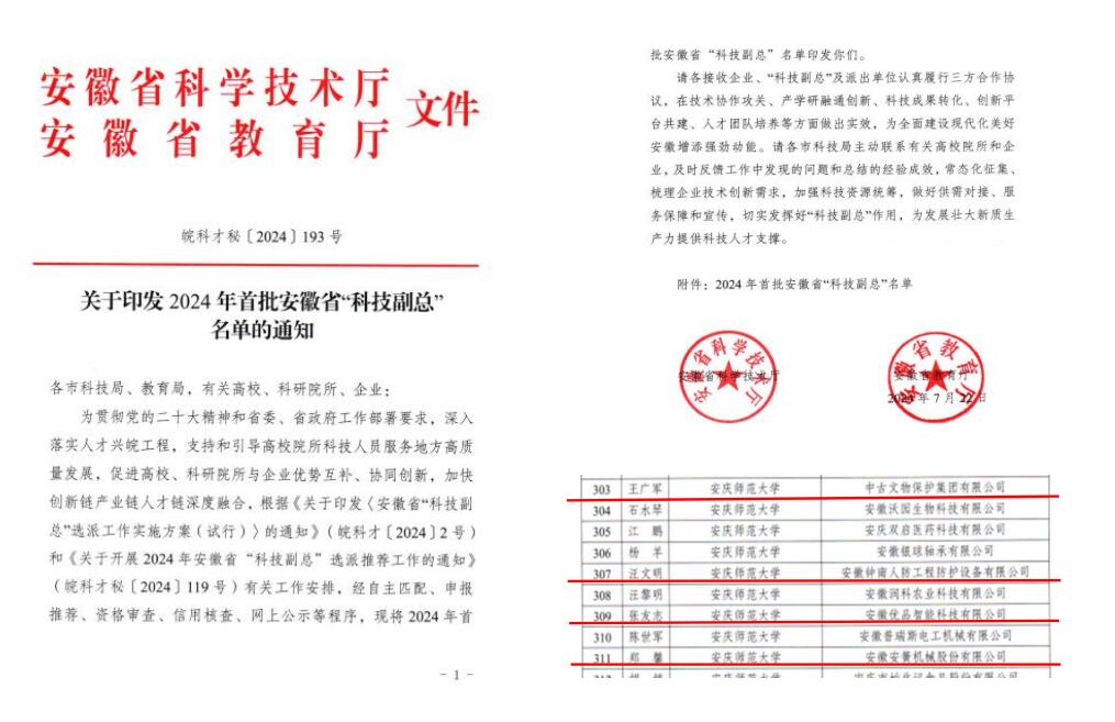 近日,安徽省科技厅、安徽省教育厅联合发布了《关于印发2024年首批安徽省“科技副总”名单的通知》,公司11名科技人员成功入选,其中公司郑馨、王广军、汪文明、张友志4名副教授入选本批次“科技副总”。