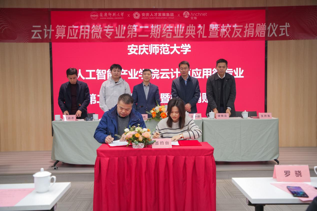 申传胜代表公司向安畅网络及安庆人才集团的大力支持表示衷心感谢。他对第二期16名学员全部通过考核并与安畅网络正式签约,实现百分之百高质量就业的成果予以充分肯定,这充分体现了校政企三方协同育人的显著成效。他对首期28名微专业毕业生共同捐赠的举动表示高度赞赏。他指出,这不仅展现了员工对母校的深厚感恩情怀,更标志着“受助—成长—反哺”育人生态已形成良性循环,成为产教融合可持续发展理念的生动实践。他表示,公司将持续完善微专业动态调整机制,拓展优质教育资源的覆盖范围,推动课程资源的开放与共享,辐射服务长三角地区高等院校,致力于打造区域产教融合的示范标杆,为地方新质生产力发展提供有力人才支撑。